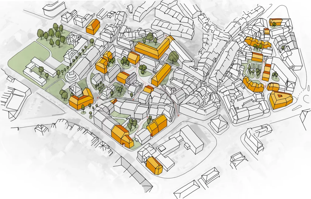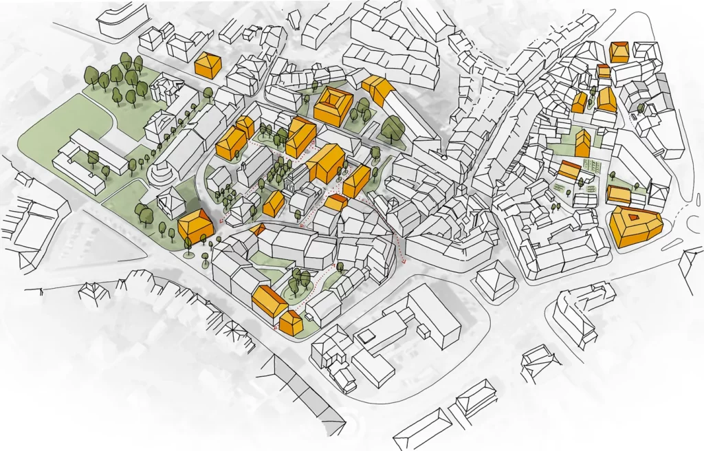 Au vu des enjeux patrimoniaux importants, nous avons finement traité le centre-ville historique en proposant une règlementation graduelle pour les interventions sur le bâti existant, en fonction des qualités urbaines et architecturales de chaque ouvrage. Les potentiels de développement (démolitions-reconstructions, surélévations) ont été réglés à l’aide de périmètres d’implantation, au cas par cas et dans le respect des prescriptions de l’ISOS. Ces dispositions vont de pair avec une définition précise de l’usage des sols, favorisant au maximum la préservation de la pleine-terre.